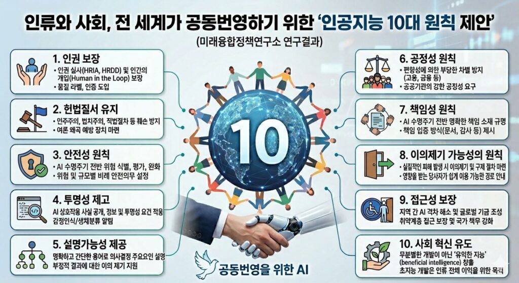 미래융합정책연구소(소장 강철하)에서는 UN, OECD, APEC 등 다양한 AI 국제원칙과 유럽연합, 미국, 중국, 독일, 한국 등 각국의 AI법제현황, 그리고 인공지능 관련 주요 법적 쟁점 분석결과를 종합하여, ‘인류, 사회가 공동번영하기 위한 인공지능 10대 원칙’을 다음과 같이 제시한다.
